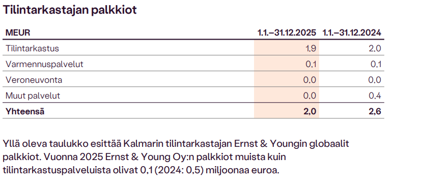 The AGM of Kalmar on 31 March 2026 elected Ernst & Young Oy as Kalmar’s auditor, in accordance with a proposal by the Board of Directors. Kristina Sandin was appointed the principal auditor by Ernst & Young. Auditors’ fees are compensated against an invoice approved by the company.
